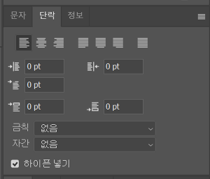 ◎ 문단(Paragraph) 패널 : 이미지에 긴 글을 입력했을 때, 문단 형식을 편집할 수 있습니다. 문단의 정렬 방식, 좌우 여백, 들여쓰기, 내어쓰기 등 기본적인 문단 편집 기능이 있습니다.