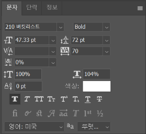 ◎ 문자(Charactor) 패널 : 문자의 속성을 조정하는 패널입니다. 문자의 글꼴, 크기, 자간, 행간, 장평, 글자 색상, 스타일 등 속성을 지정할 수 있습니다.