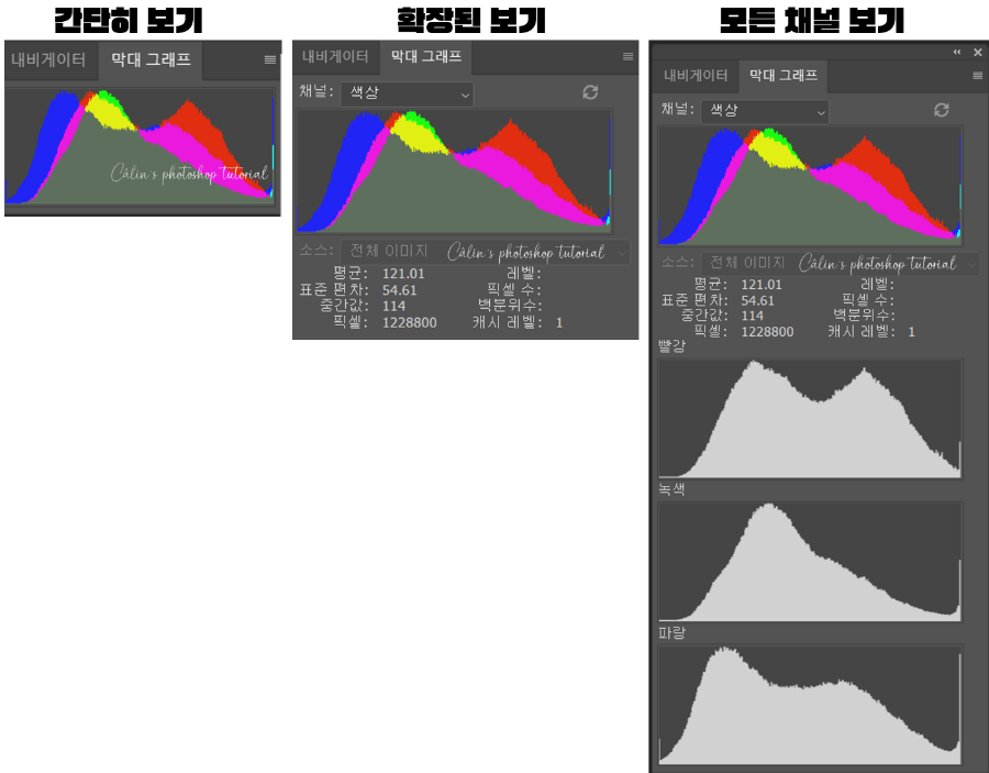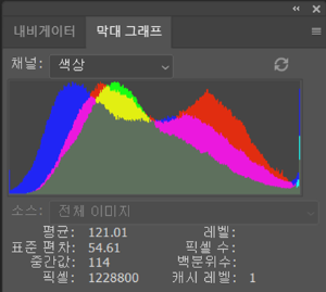 ◎ 막대 그래프(Histogram) 패널 : 이미지 모드(Image Mode)별로 색상 분포도를 그래프 형식으로 보여줍니다.