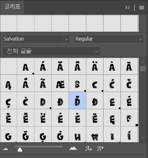 ◎ 글리프(Glyph) 패널 : 선택된 폰트(글자체)의 전체 문자 모양을 보여줍니다.