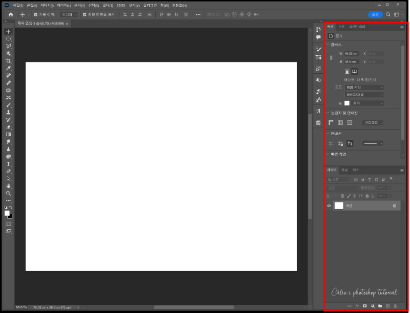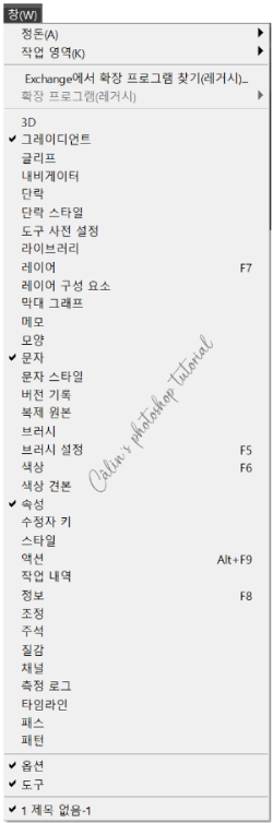 포토샵 상단 메뉴바에서 창(Window) 메뉴를 클릭하면 모든 패널을 확인할 수 있고, 사용할 패널만 선택해서 우측 패널을 정리할 수도 있습니다.