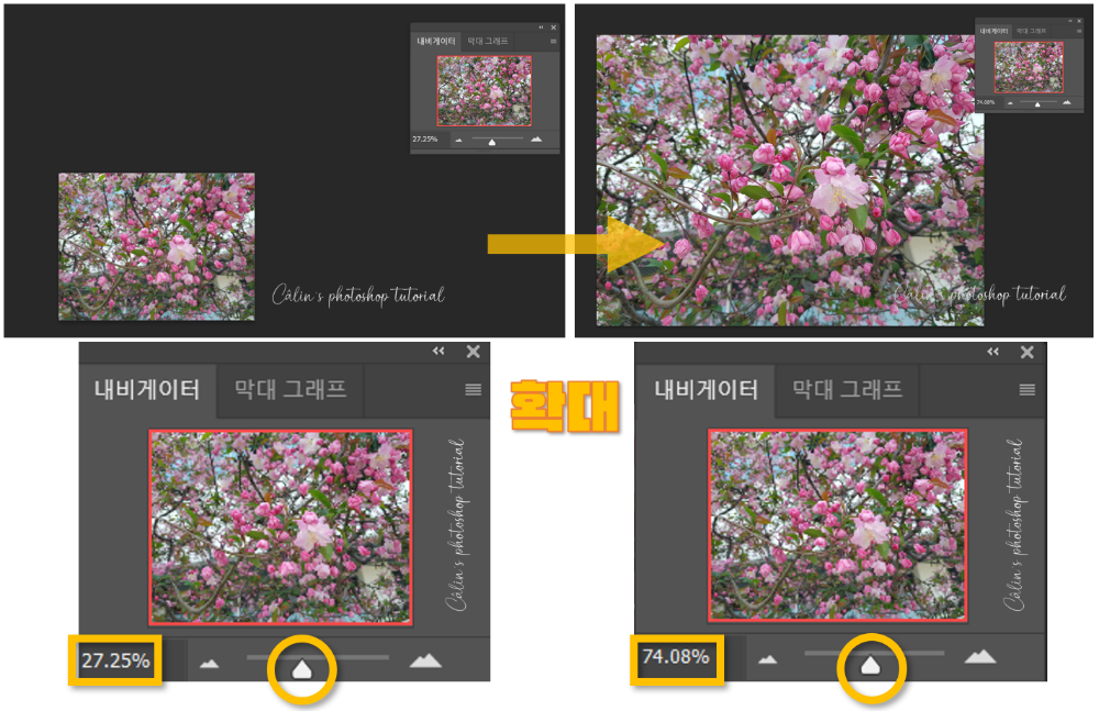 ◎ 내비게이터(Navigator) 패널 : 패널 좌측하단의 수치를 수정하거나 하단 바의 뾰족한 아이콘을 움직이는 방법으로 이미지를 축소하거나 확대할 수 있습니다.