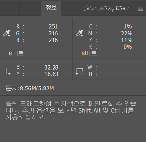 ◎ 정보(Info) 패널 : 커서가 가리키는 지점의 색상 정보, 이미지 크기, 커서의 좌표값, 컬러 모드에 따른 색상 정보값 등을 수치로 표시합니다.
