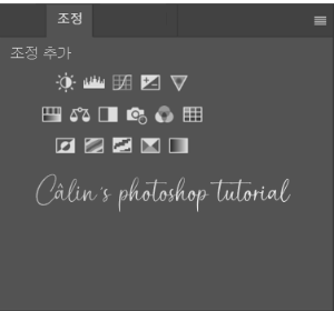 ◎ 조정(Adjustments) 패널 : 명도, 대비, 색조, 채도 등 보정 기능을 모아놓은 패널입니다. 아이콘을 클릭하면 속성 패널이 열리며 각 기능의 세부 사항을 조정할 수 있게 됩니다.