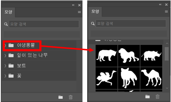 ◎ 모양(Shapes) 패널 : 포토샵에서 제공하는 여러 가지 모양을 적용할 수 있습니다.
