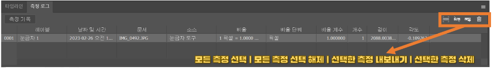 ◎ 측정 로그(Measurement Log) 패널 : 측정 도구(눈금자 도구, 카운트 도구)로 측정한 기록을 추가하고 정보를 관리합니다.