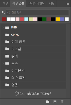 ◎ 색상 견본(Swatches) 패널 : 다양한 색상 샘플을 선택해서 사용할 수 있고, 작업자가 원하는 색상을 등록해서 사용할 수 있습니다. 최근 사용한 색상이 자동으로 색상 견본 패널 상단에 등록됩니다.