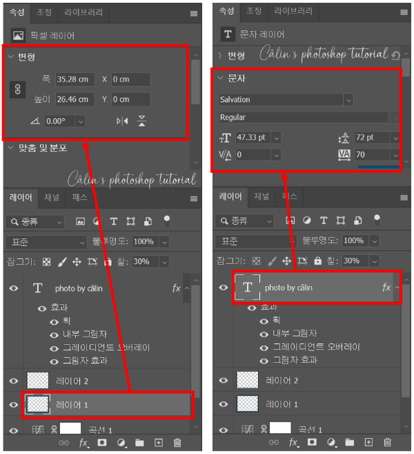 이미지에 작업을 하면 적용된 모든 도구와 효과가 '레이어'에 등록됩니다. '속성 패널'은 선택되어 있는 '레이어'의 '속성'만 보여주며 레이어의 종류(문자 레이어, 조정 레이어, 모양 레이어 등)에 따라 속성의 내용도 다릅니다.