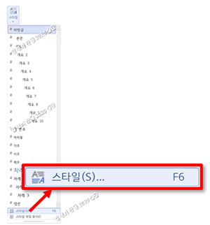 ③ 스타일 단축키를 이용해서 스타일을 적용할 수도 있습니다. 스타일 대화상자의 '목록'을 잘 보시면 '단축키'가 표시돼 있어요. 자주 사용하는 스타일이라면 단축키를 알아두었다가, 필요한 부분에서 간단하게 스타일을 적용할 수 있습니다.