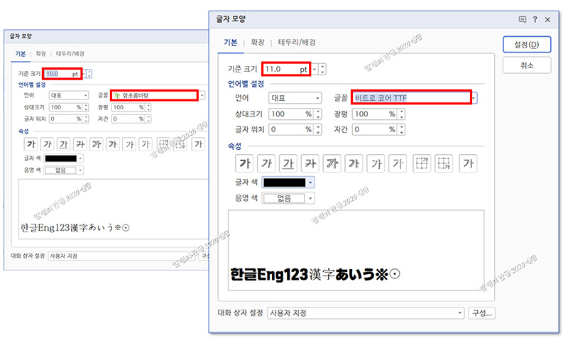 기준 크기를 11로 변경하고, 글꼴을 비트로 코어 TTF로 변경한 뒤 '설정'을 클릭해 설정을 완료합니다.