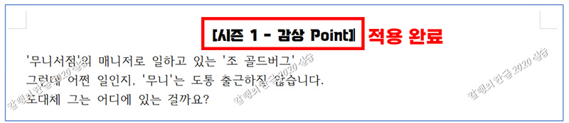 아래 글에서 [시즌 1 - 감상 Point]의 글꼴과 문단 모양을 '소제목'에 어울리게 '스타일'로 설정해보겠습니다.