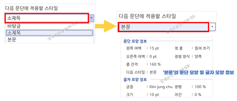 '소제목'으로 설정돼 있었는데요. 다음 문단 스타일을 '본문'으로 수정하고, '본문'의 문단과 글자 모양을 아래와 같이 수정한 뒤에 적용을 해볼게요.