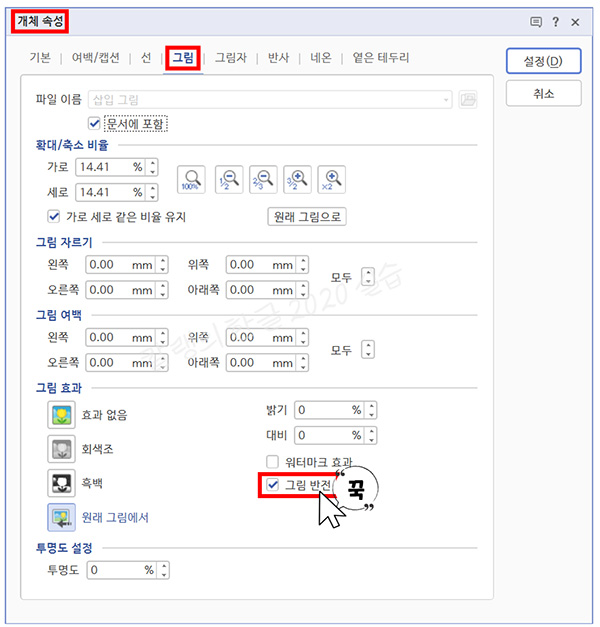 ④ [그림 효과] 항목에서 [그림 반전] 앞의 상자에 체크 표시를 합니다.