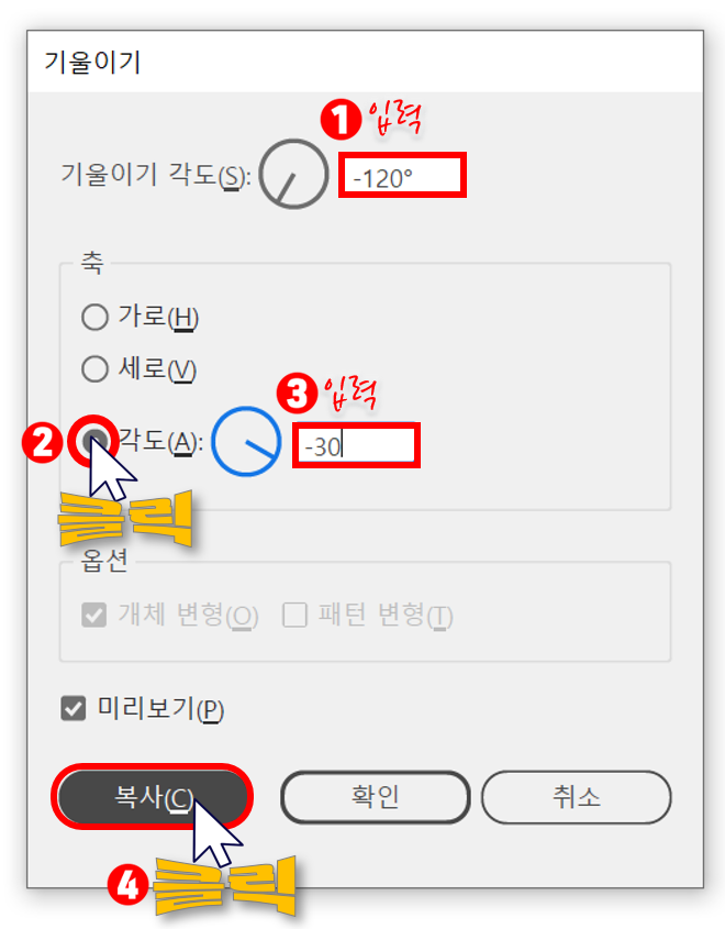 ④ 기울이기 옵션 대화상자가 표시되는데요.